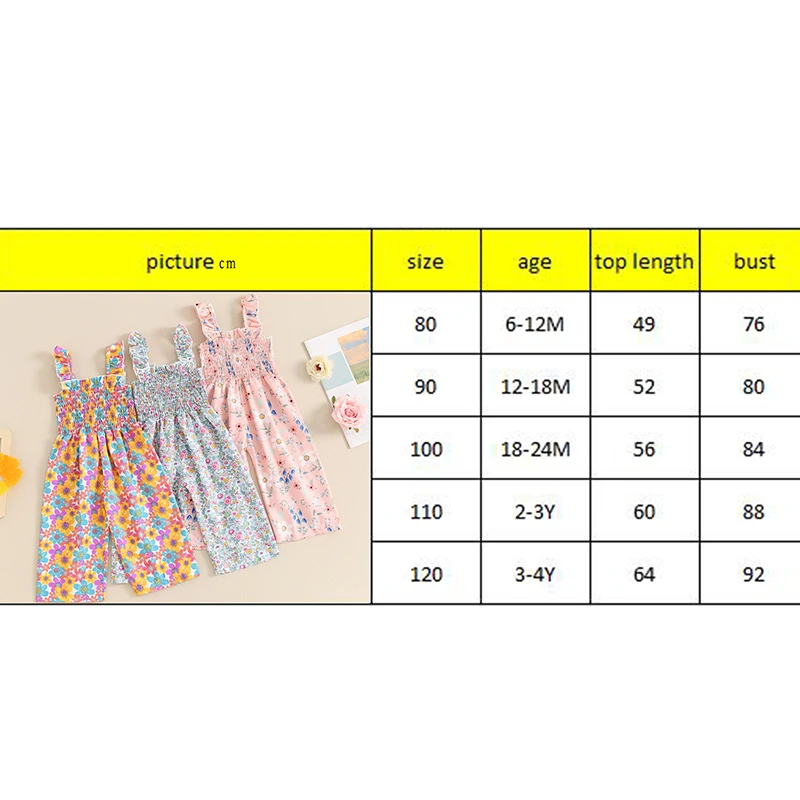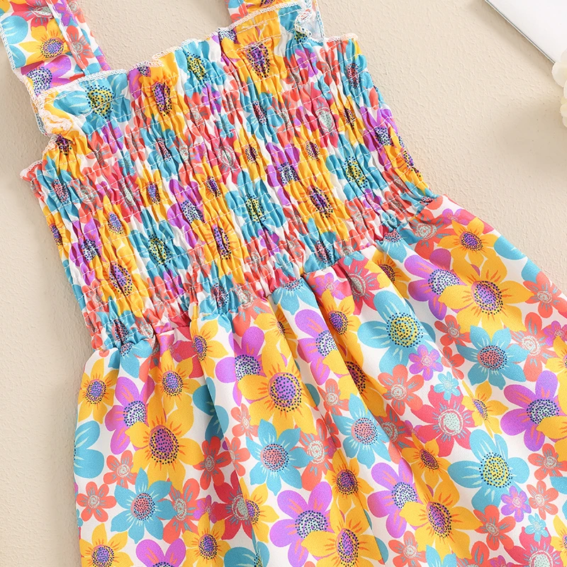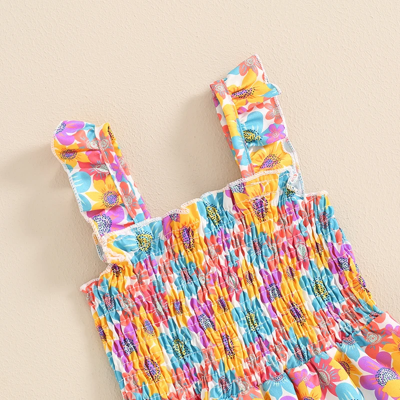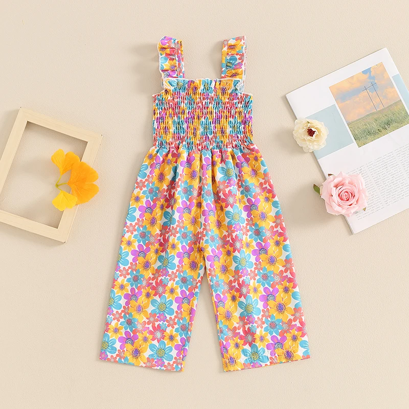 Floral print, sleeveless, ruffled, stretch ruched chest, wide legged pants design, toddler girls jumpsuit is the perfect way to add some personality to your child's closet.