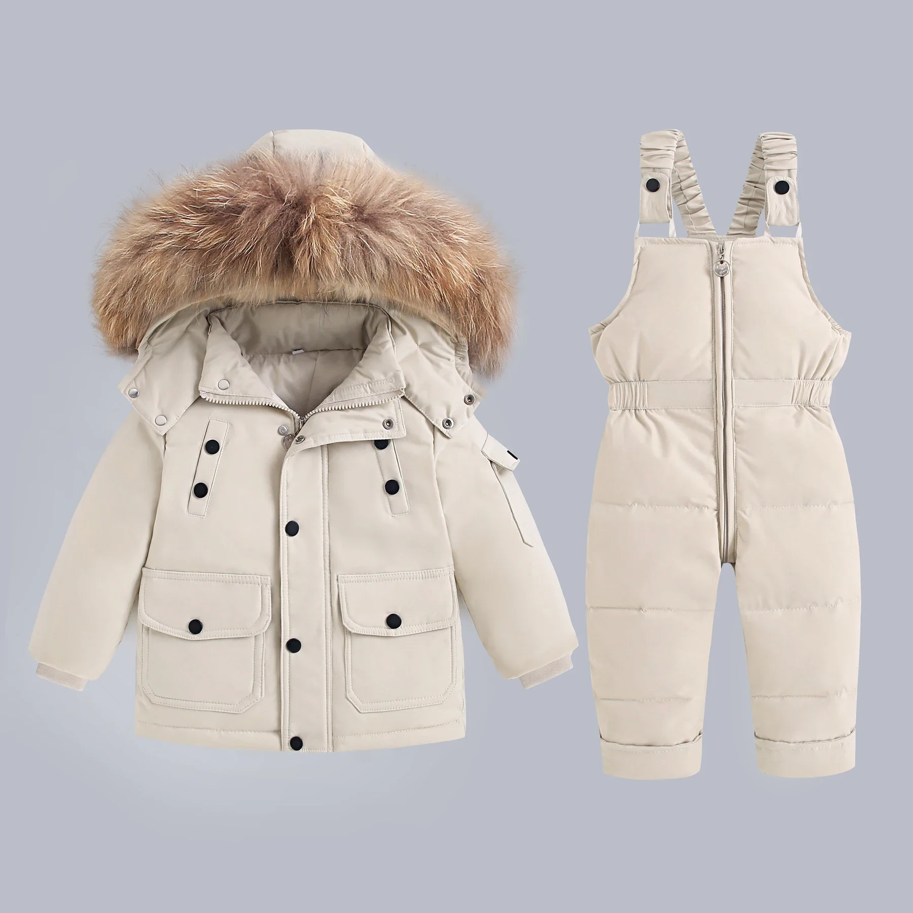 OLEKID 2025 Winter Children Boy 2PCS Clothes Set Waterpoof Hooded Real Fur Down Jacket Girls Overalls 1-5 Year Kids Snowsuit